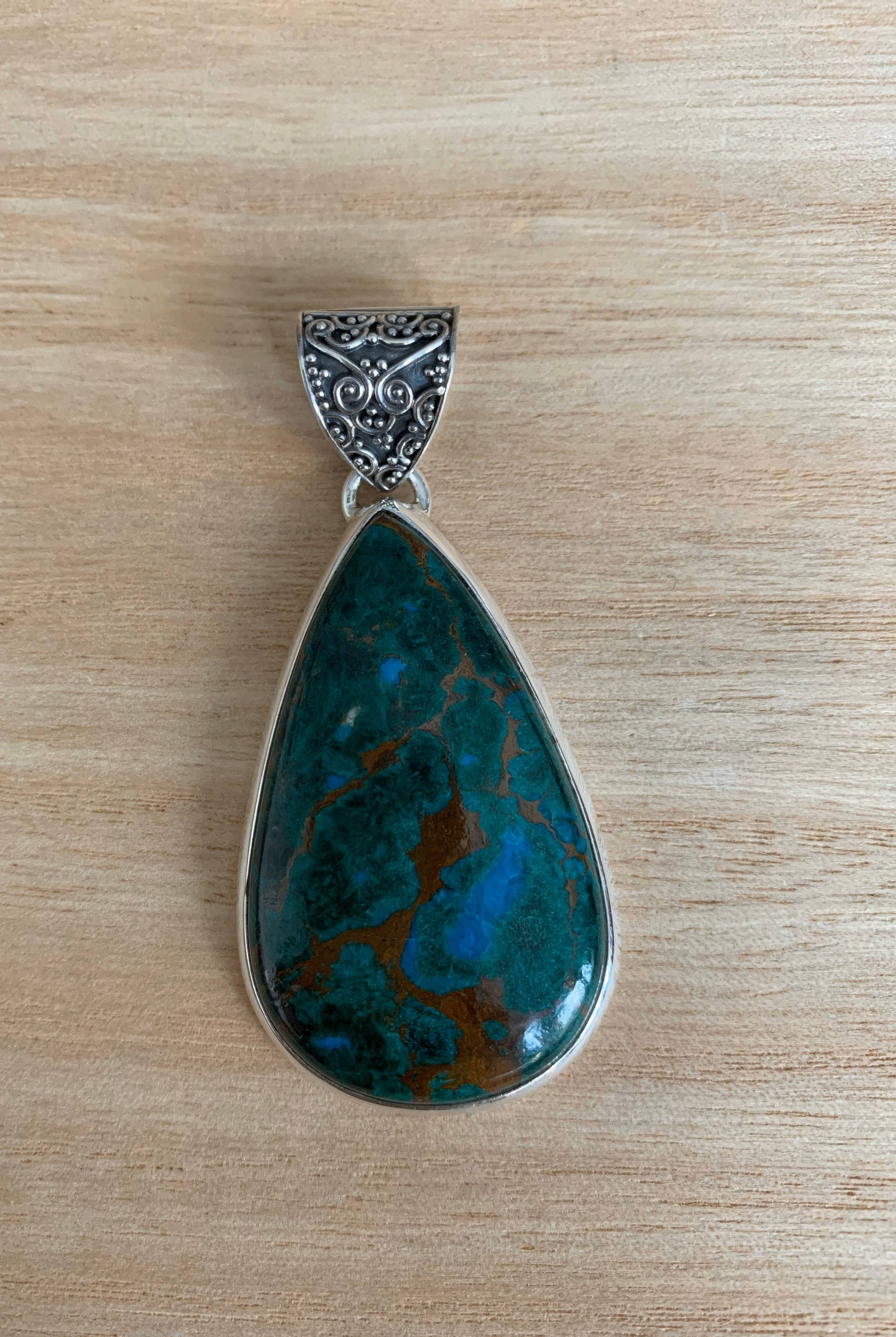 Lovely azurite malachite and sterling silver pendant in an tear drop shape.
