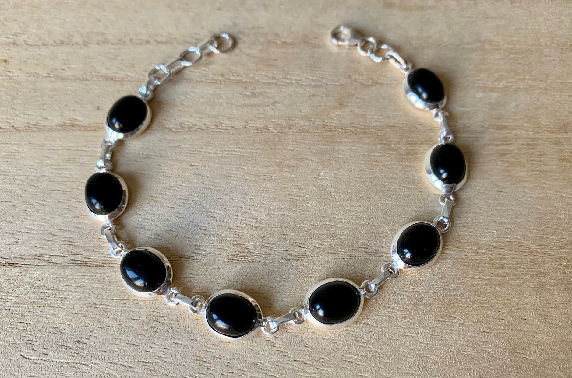 Lovely black onyx and sterling silver bracelet. The bracelet has 8 individual black onyx in an oval shape.