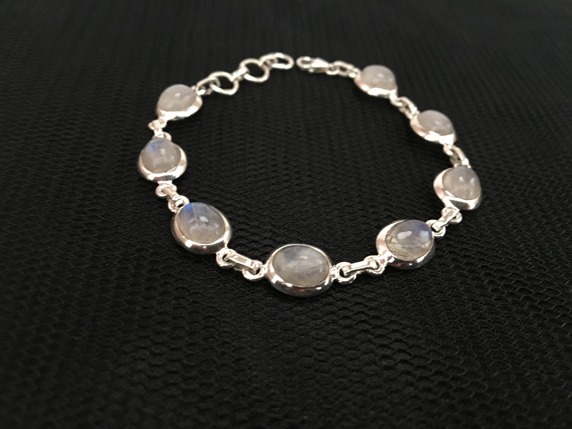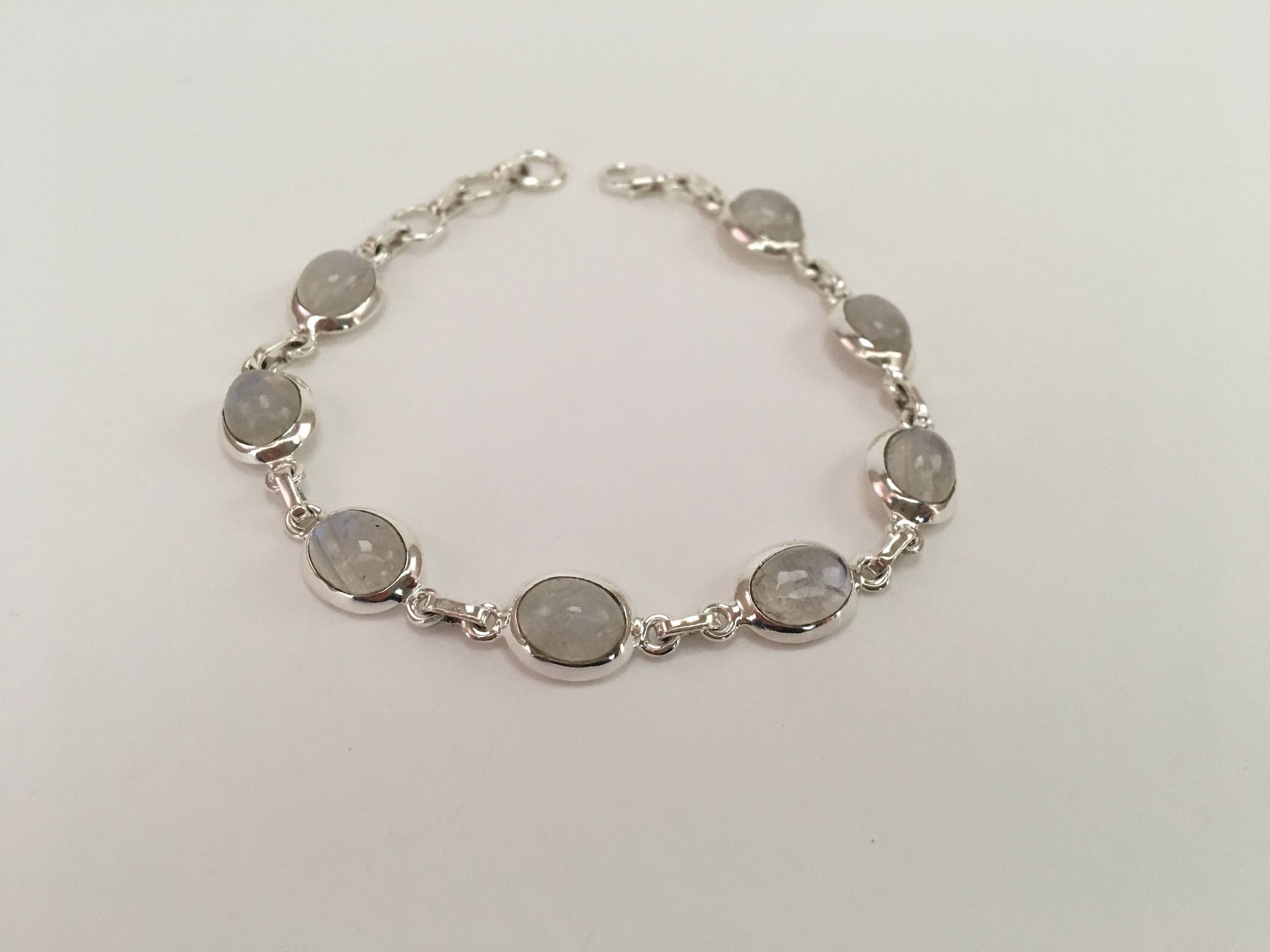 Lovely moonstone and sterling silver bracelet. The bracelet has 8 individual rainbow moonstone in an oval shape.