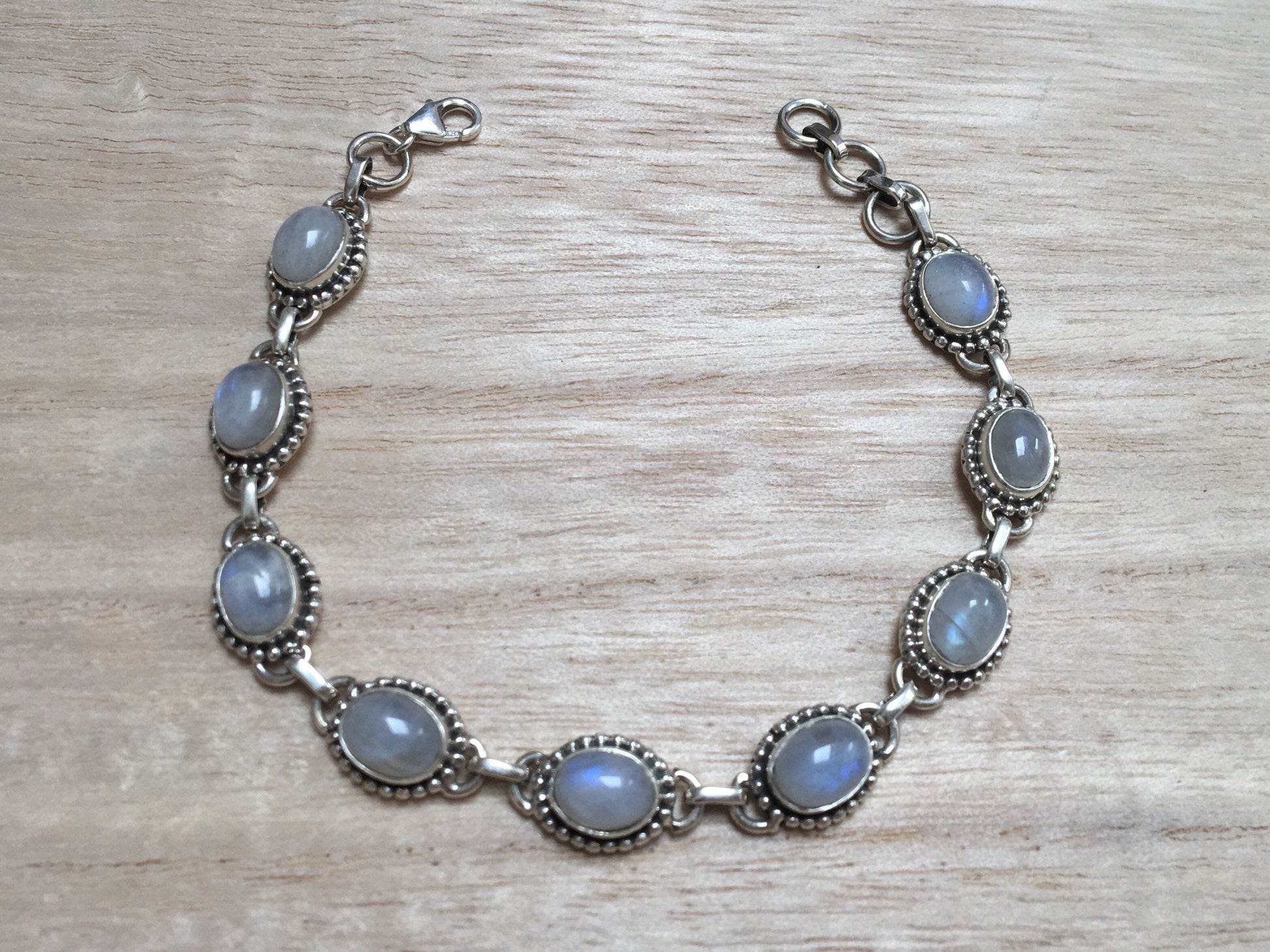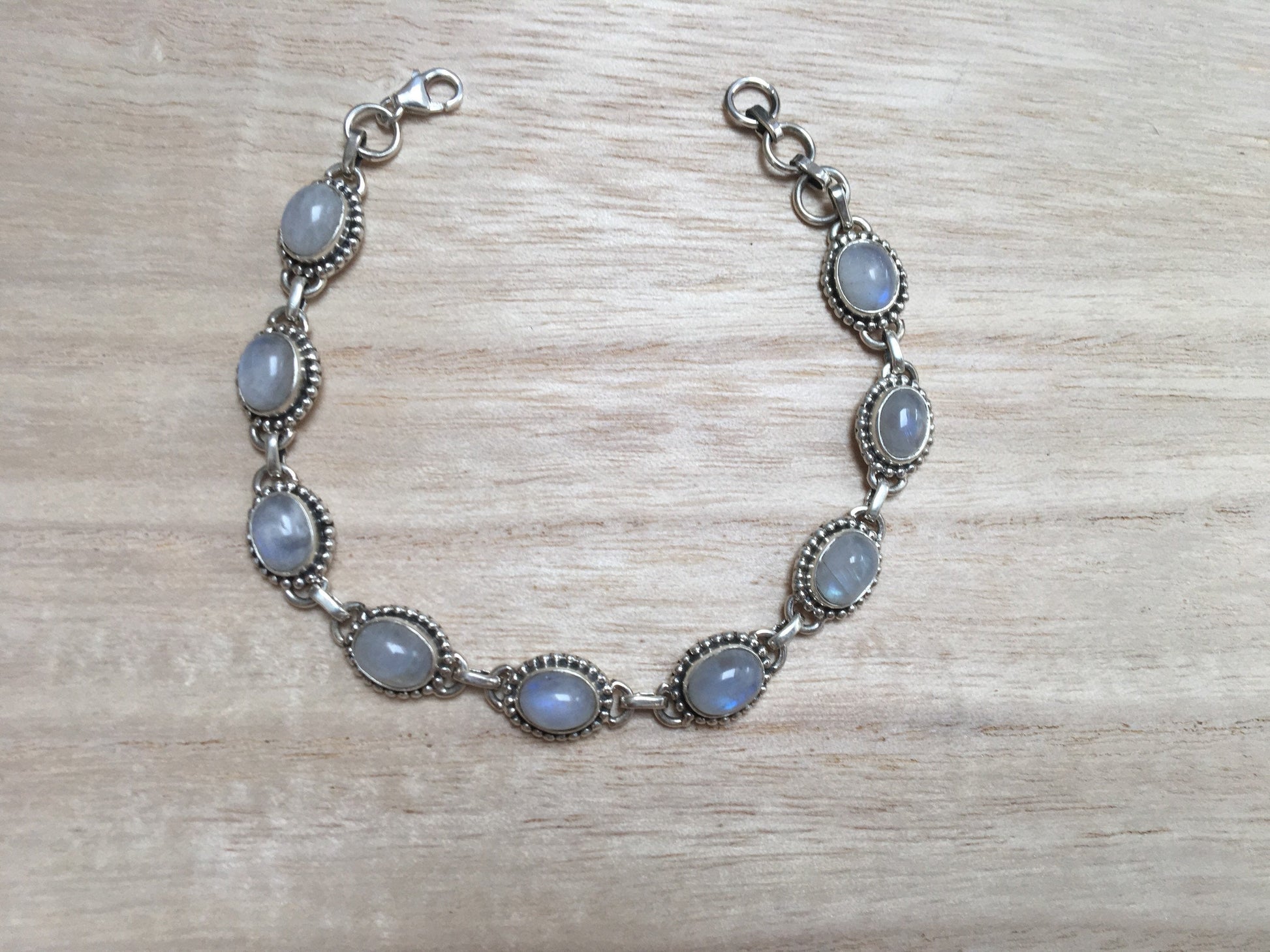 Lovely moonstone and sterling silver bracelet. The bracelet has 10 individual rainbow moonstone in an oval shape.