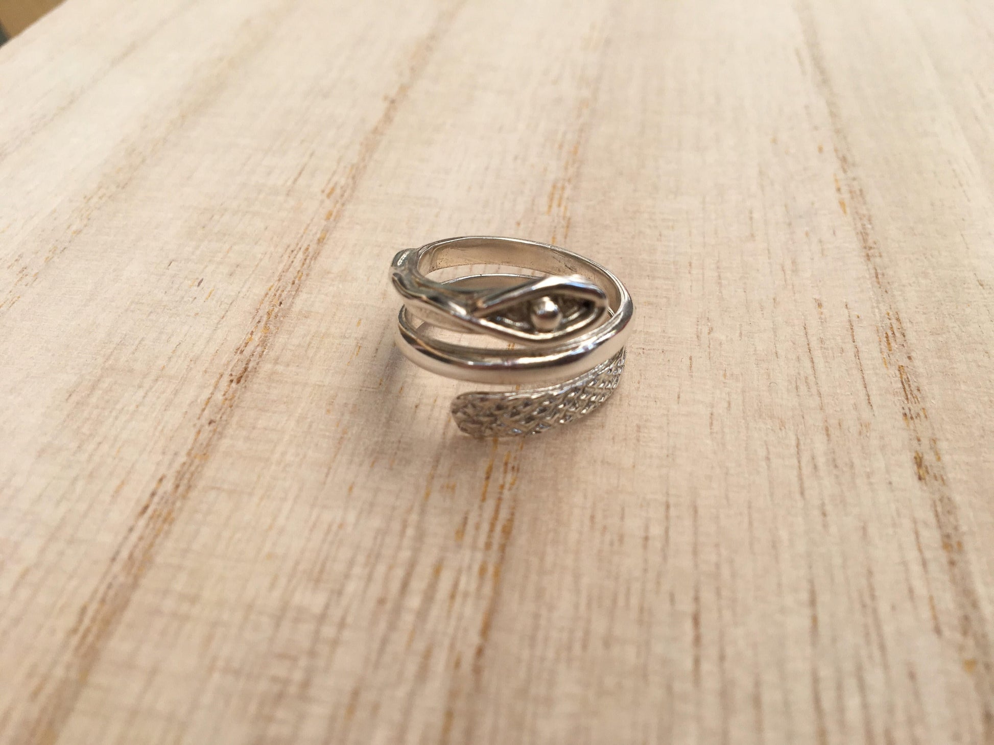 The ring is made of silver in the shape of a snake. It is really easy to adjust to your size.